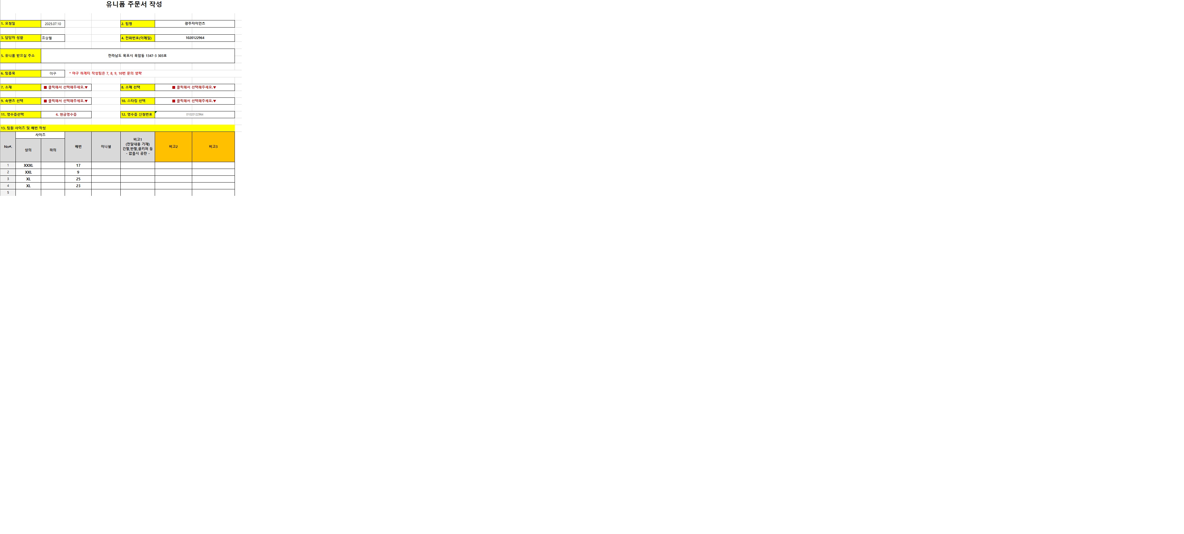 유니폼 주문시 아래 첨부된 파일 양식(유니폼주문서)을